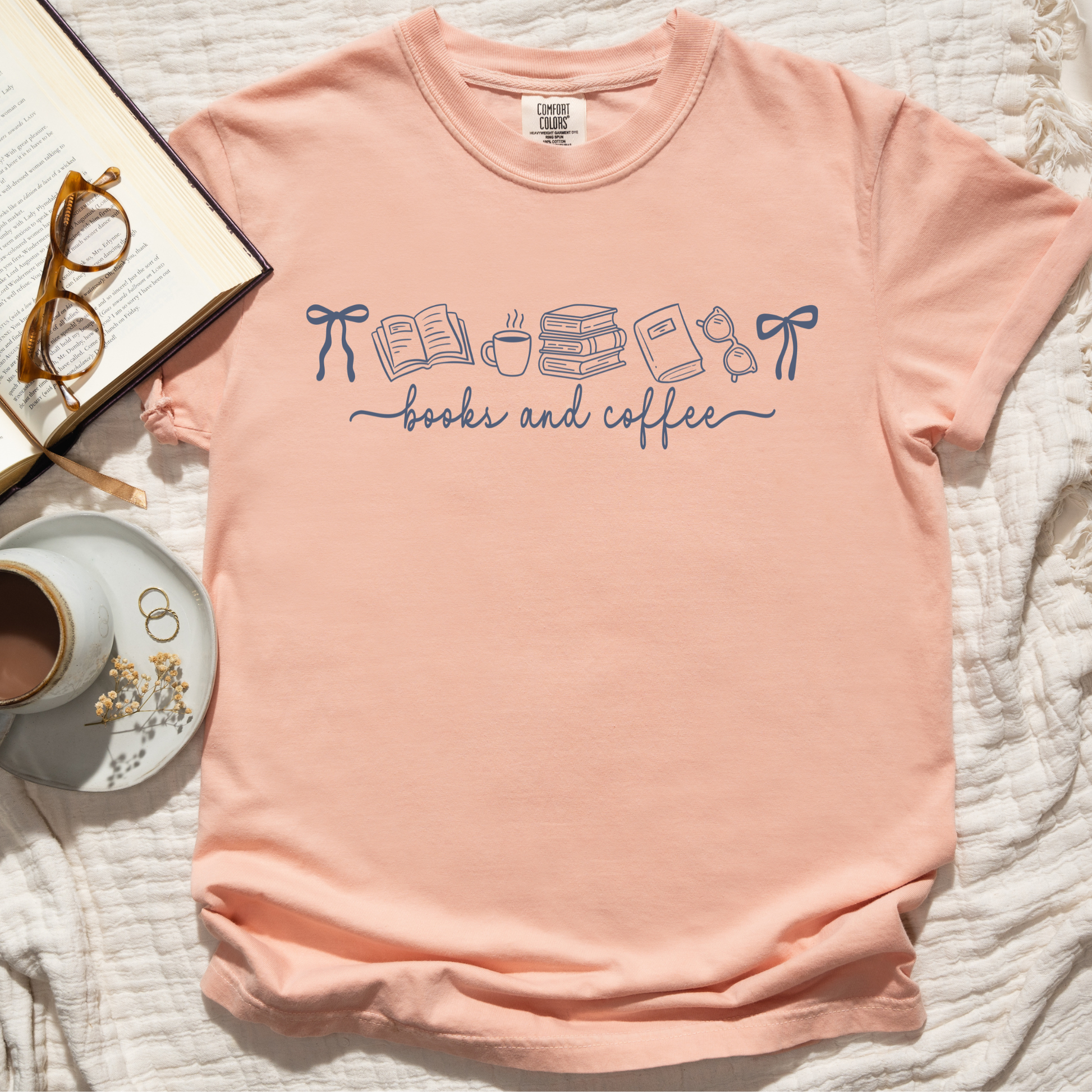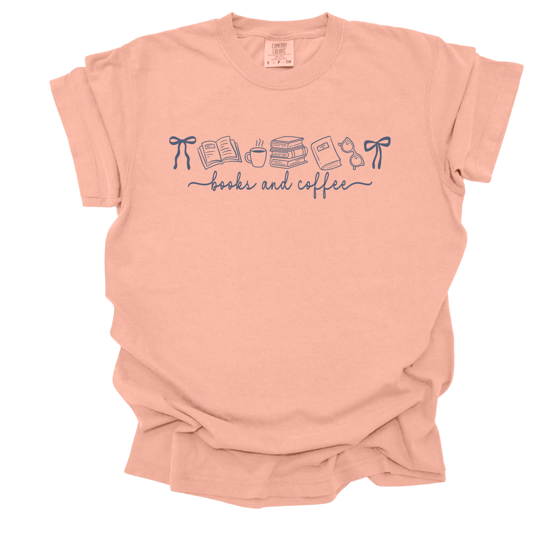 For those who believe the best days start with a hot drink and a good read. This soft peach tee features a whimsical design of books, bows, and coffee.